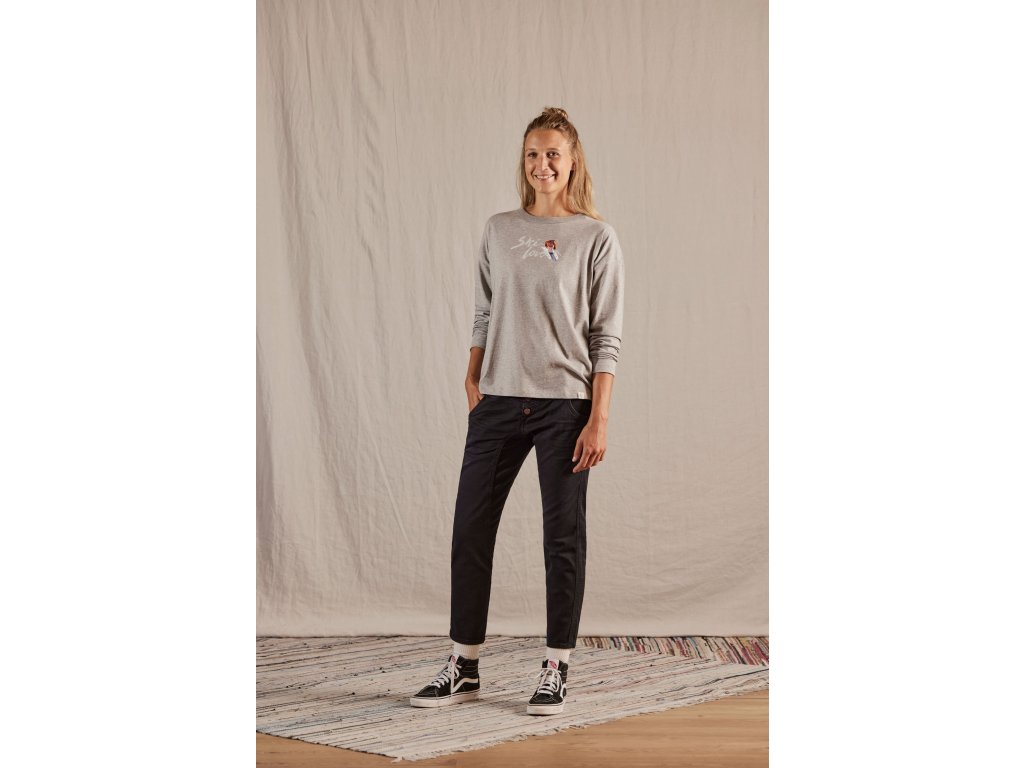 Pohodlné tričko s dlouhým rukávem z měkké organické bavlny s lemem ze žebrovaného úpletu kolem výstřihu. Potisk grafikou Ski Love (s motivem lyžaře, běžkaře nebo ski alpinisty) vychází z kresby voskovkou.Doplňkové parametry